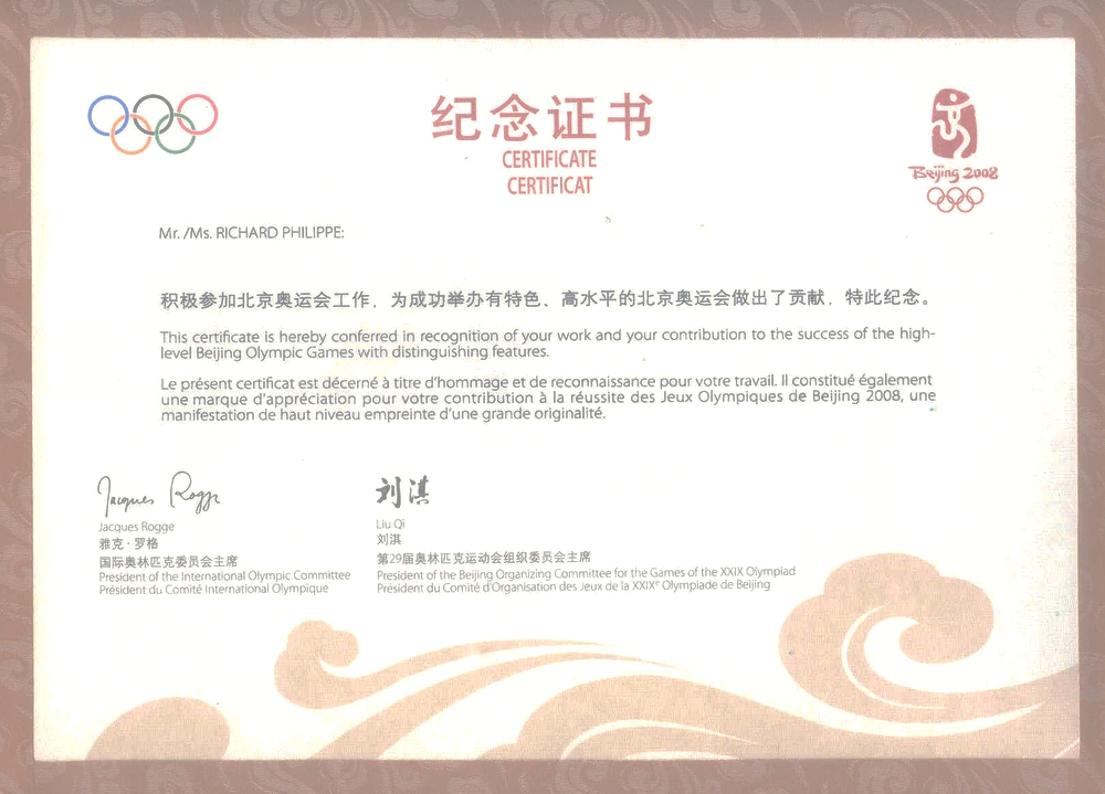 CERTIFICAT DE CONTRIBUTION AUX J.O. BEIJING 2008