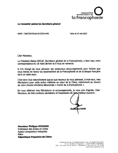 Je sais que je vous écris tardivement mais le Secrétaire général de la Francophonie m'a chargée de vous transmettre ses remerciements les plus chaleureux pour votre engagement en faveur de la Francophonie et particulièrement pour cette belle chanson diffusée dans le cadre des activités organisées autour de la Journée internationale de la Francophonie, le 20 mars dernier. En vous remerciant et bien cordialement, Julie TILMAN.